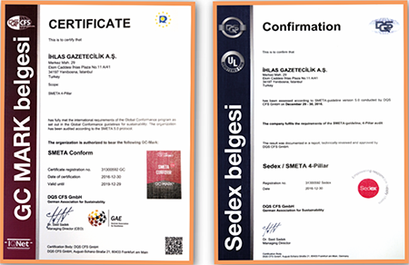 İhlas Matbaacılık, kendi sektöründeki kalitesini dünya standartlarında tescilleyerek büyük bir başarıya imza attı. DQS firmasının aracılığı ile Almanya Frankfurt merkezli uluslararası kalite onay kuruluşu Sedex’in denetimine giren İhlas Matbaacılık, iki ayrı uluslararası kalite belgesi aldı.